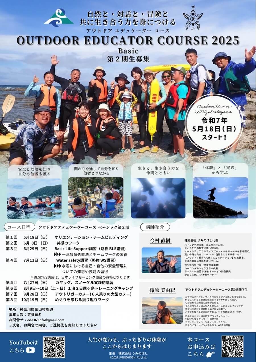 学生時代から海に魅せられ、ライフセーバーとして長年にわたり海と人の安全に関わる活動に従事。「海は師であり、仲間であり、挑戦の場でもある」という想いのもと、カヤック、ヨット、サーフィン、ダイビング、素潜りなどを通し、子どもたちに本物の自然のなかでの学びを届けている。