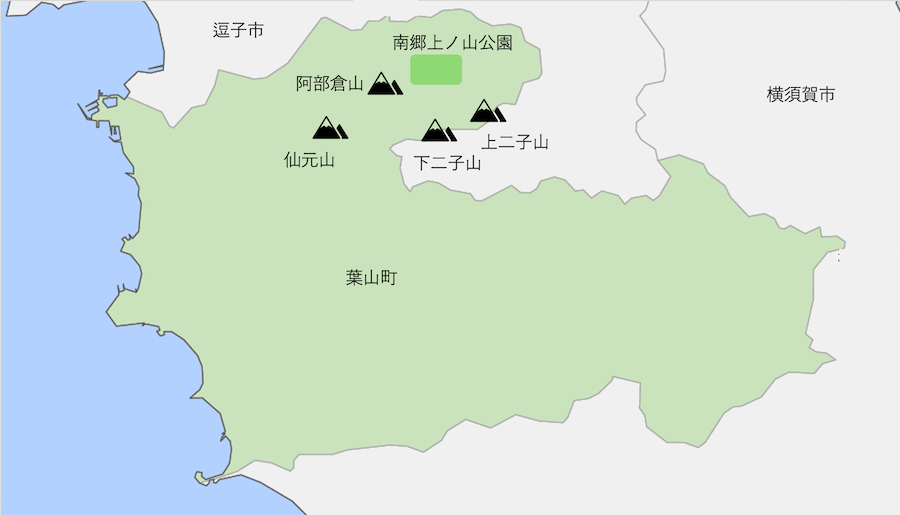 三浦半島の北部、二子山、仙元山を中心にした、逗子・葉山・横須賀にまたがる標高200m前後の山域の通称。森戸川の源流にもあたる。