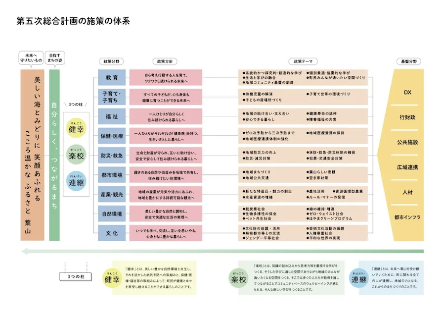 現在、2025〜2040年度を計画期間とする「第五次葉山町総合計画」の「基本構想」、2028年度までを計画期間とする「基本計画」の第1期が策定され、毎年見直される「実施計画」に反映されている。
