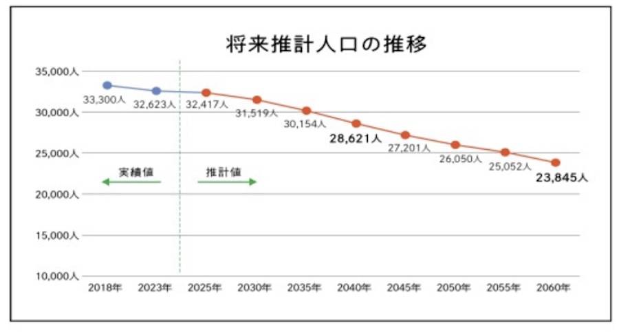 2026年時点で微減している葉山の人口も、人口減少が加速するこで、2040年には28000人台に。