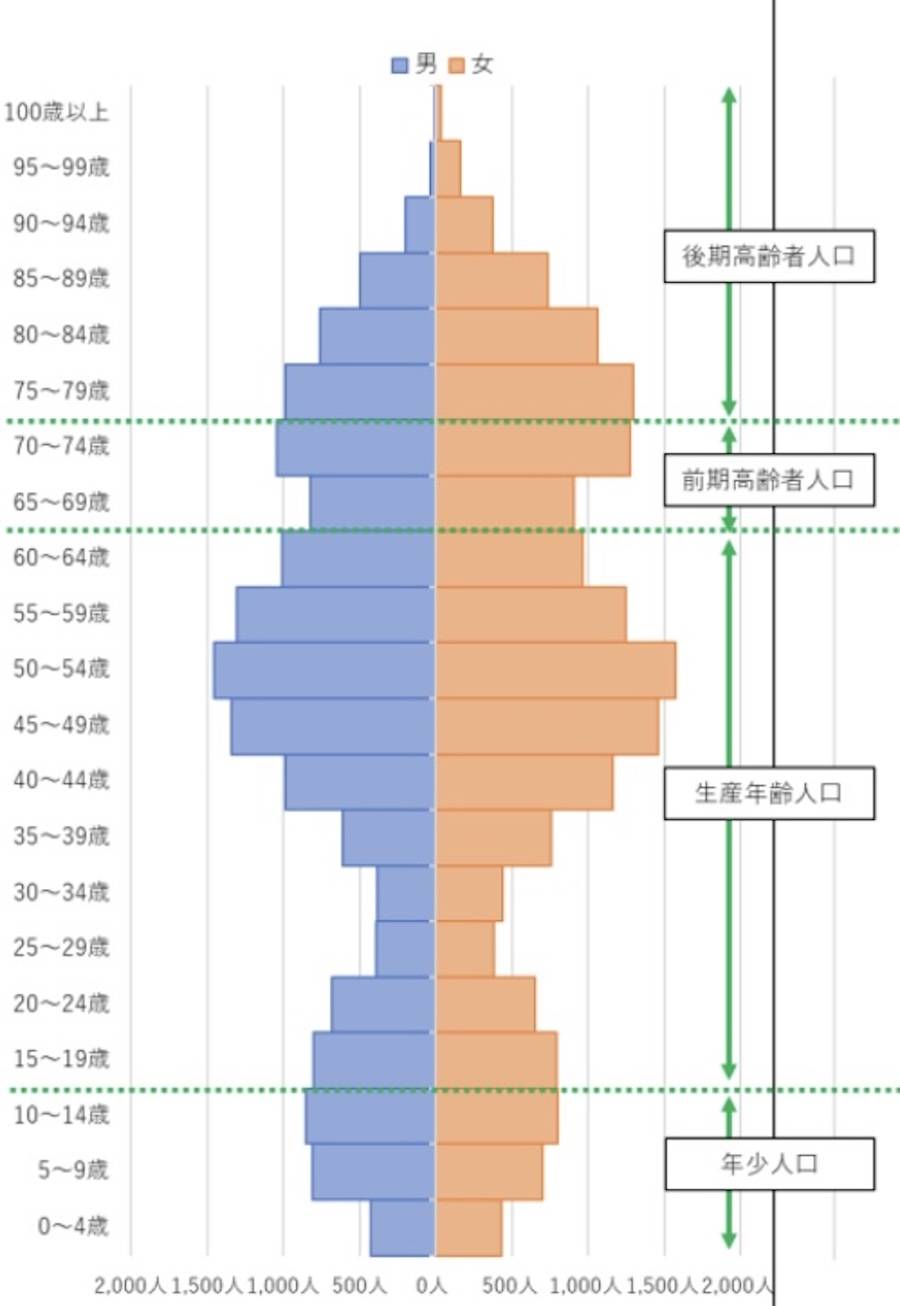 20〜30代の人口の少なさは、若い世代の転出も影響か。逆に子育て世代が転入することで30代後半から人口は増えてきている。