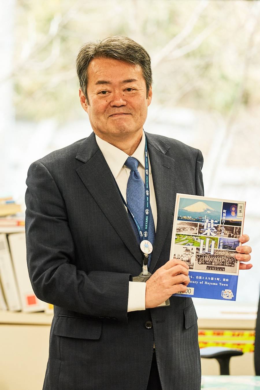 葉山町役場にて。手にしているのは、町制施行100周年記念誌『葉山』。