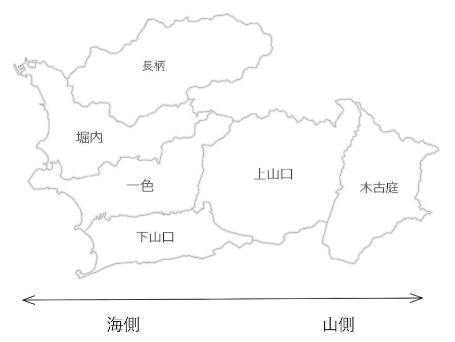 葉山町の行政区。あきじさんの生まれた上山口地区(写真)は、山側のエリア。多くが市街化調整区域に含まれるため、里山などの原風景が比較的残っている。
